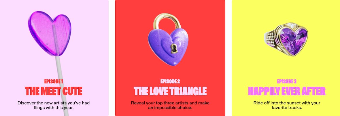 The recap unfolds in three episodes. It starts with “Meet Cute,” which focuses on all the new artists users discovered this year. “Love Triangle” follows with the top three artists they rotated the most. The final episode, “Happily Ever After,” wraps up the experience by spotlighting their favorite tracks of the year and offering a personalized playlist to keep the vibes going.